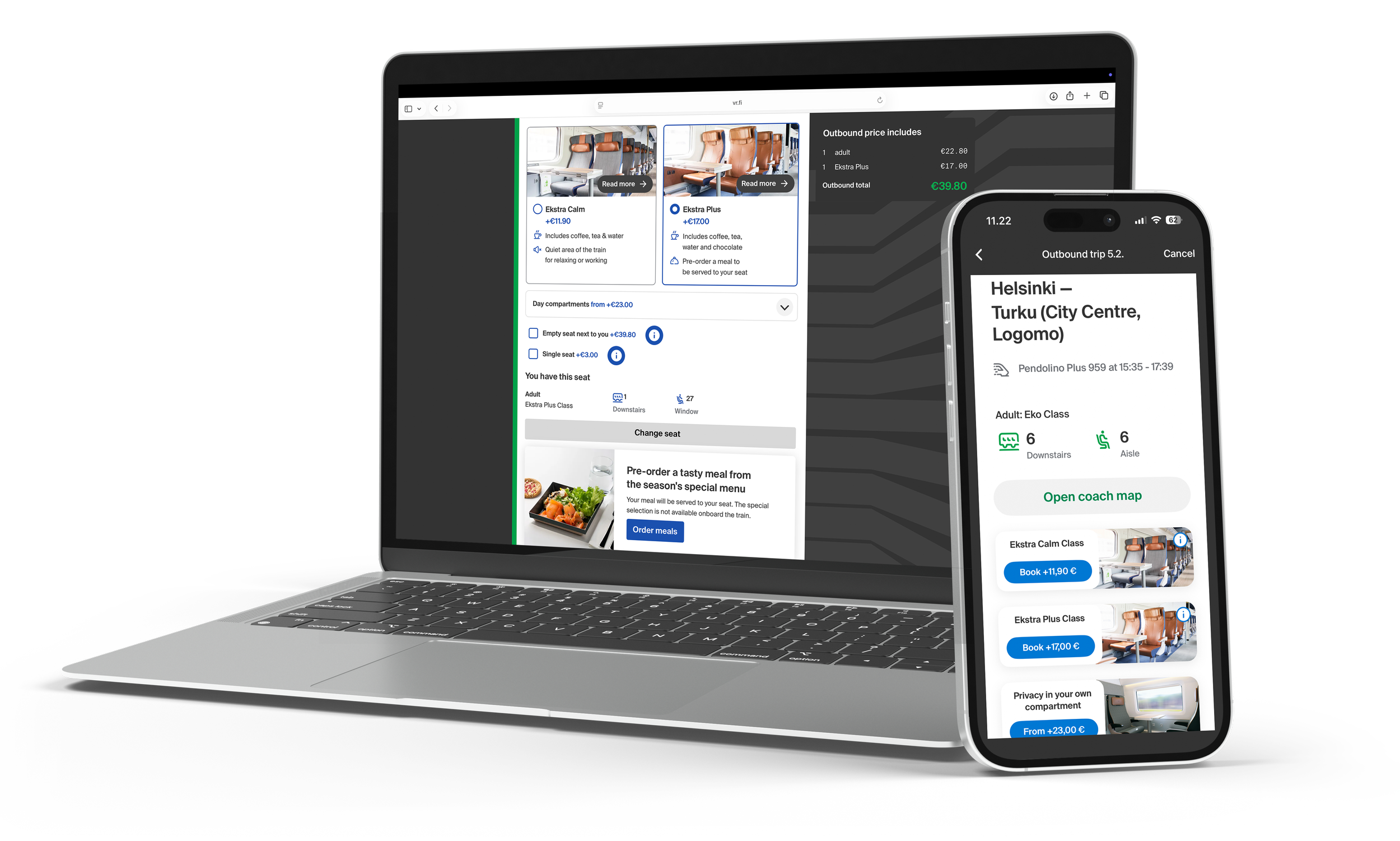 Uudistus kattoi kaikki asiakaskanavamme, jossa asiakas voi ostaa matkansa (mobiilisovellus VR Matkalla, websivusto VR.fi ja lipunmyyntiautomaatit asemilla, asiakaspalvelun ja kohtaamispisteen Helsingin asemalla). Rakensimme taustajärjestelmien avulla asiakkaiden saataville uudet junat, niiden vaunukartat ja palvelut sekä täysin uutena tuotteena toimme VR.fi:hin Ekstra Plus -luokan matkustajille ennakkoon tilattavat ateriat sekä suunnittelimme niille selkeän ja sujuvan ostopolun digitaalisissa kosketuspisteissä. Digitaalinen kokemus ulottui myös pre-departure vietinnän suunnitteluun ja testaukseen. Jatkossa ateriatuotteet tuodaan saataville myös VR Matkalla -mobiilisovellukseen, jotta tilaaminen olisi asiakkaille entistä helpompaa.